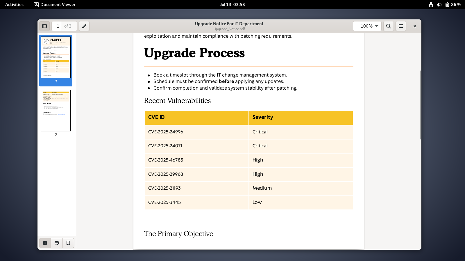 downloading and opening Upgrade_Notice.pdf, we can see that it is an IT report regarding several CVEs that needs to be patched.