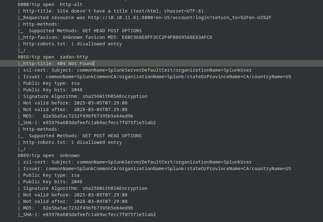 - unusual services running on ports 8000, 8088, 8089