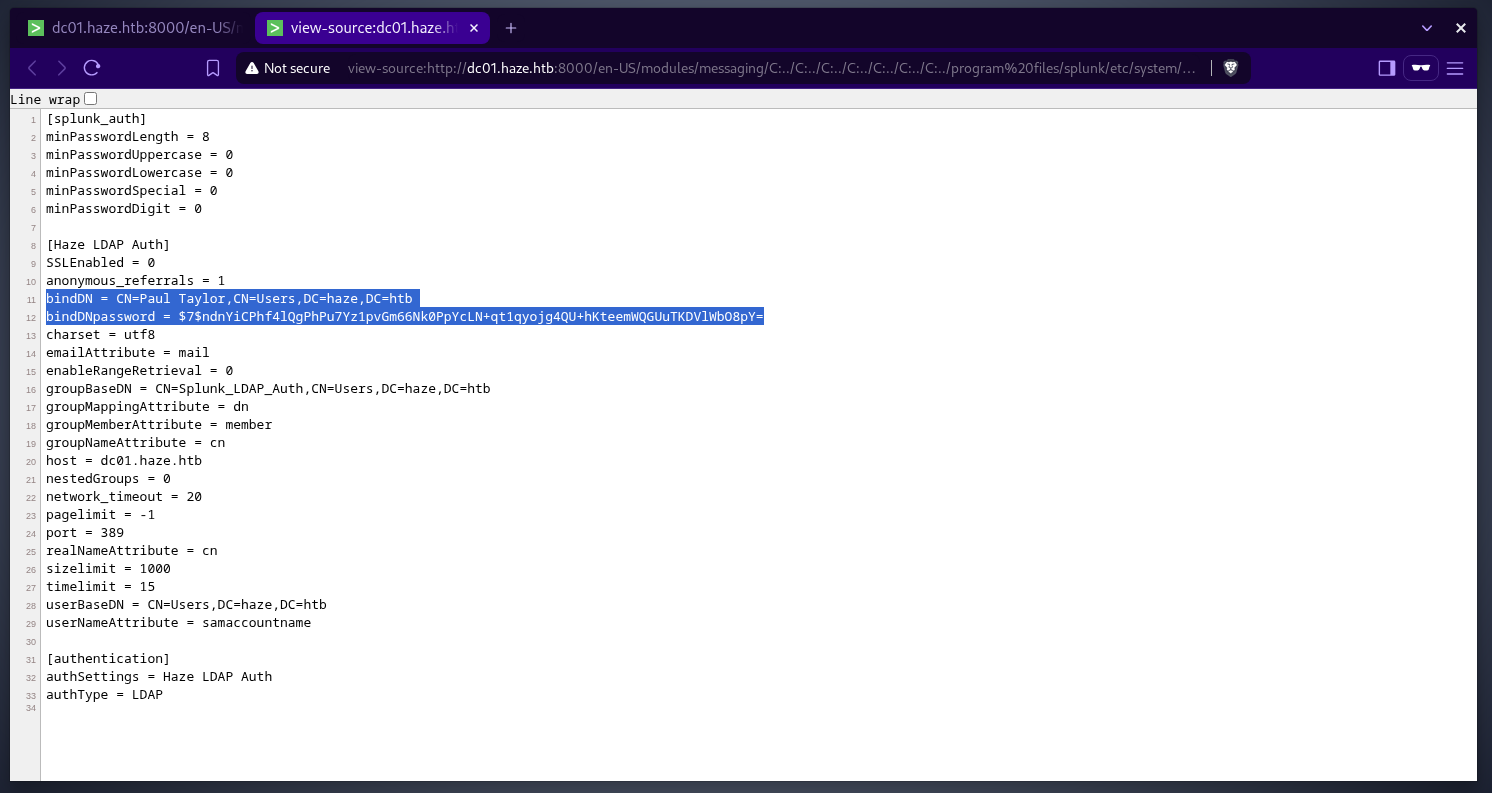 there is an ldap authentication configured using paul tayloruser and the password looks like it is hashed or encrypted. splunksecrets from HurricaneLabs can be used to decrypt paul’s password