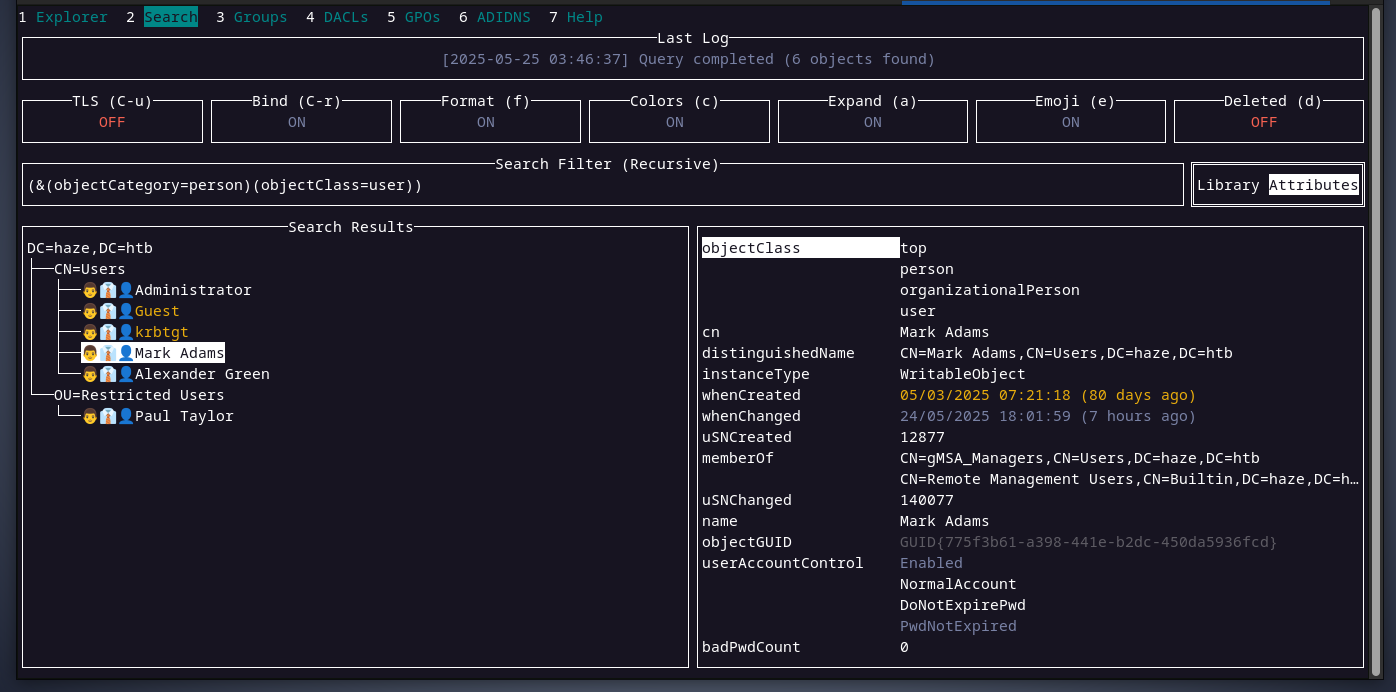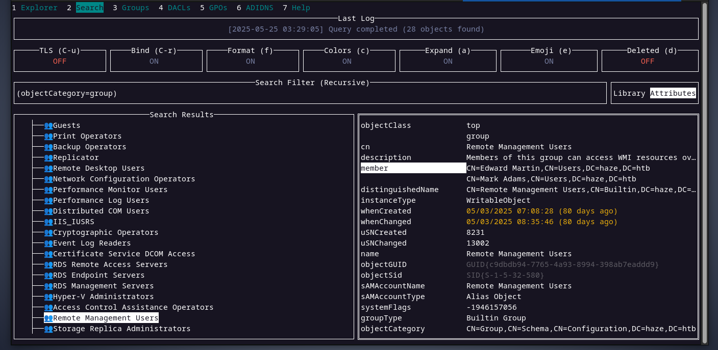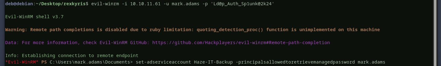 also, mark is a member of the remote management users group as we can see above. now, with the information we collected above, we will access the domain controller using winrmto update the msDS-GroupMSAMembership attribute of haze-it-backup$ account to allow mark to read its password.