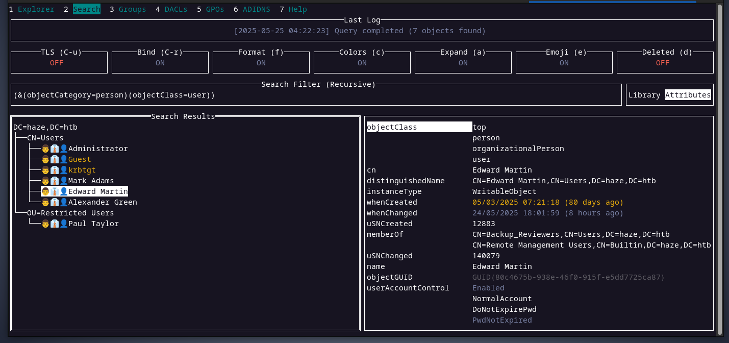 interesting, let’s try switching again from mark to haze-it-backup$ account for domain enumeration. and here it is, we can see now the user edward after switching to haze-it-backup$