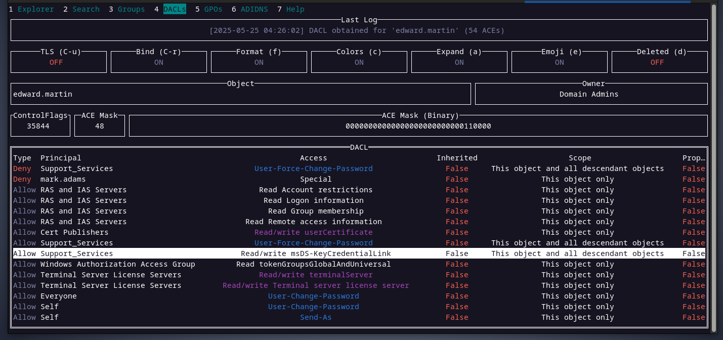 checking edward’s DACL, we can see that members ofsupport_servicesgroup can read and write to themsDS-KeyCredentialLinkattribute. this attribute allows an account to have an alternative authentication method like usingpublic-privatekey for authentication instead of a password.