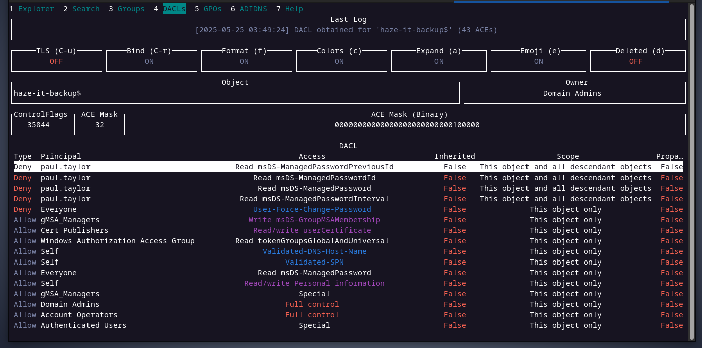 checking Haze-it-backup$’s DACL, we can see that members of thegMSA_Managersgroup have write permission over the attributemsDS-GroupMSAMembership, and this attribute specifies who can read gMSA’s password