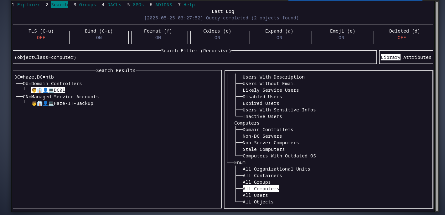 with valid domain user credentials in our hands, we can perfrom an authenticated domain enumeration. i will use the tool godap. checking all the computers in the domain, there are two computers,