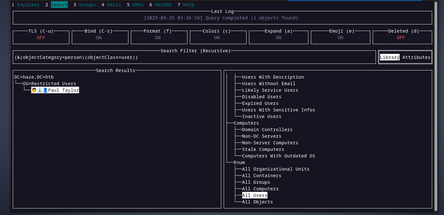 it seems like the user paul is the only user in the domain, and it is inside an OU called restricted users. interesting.
