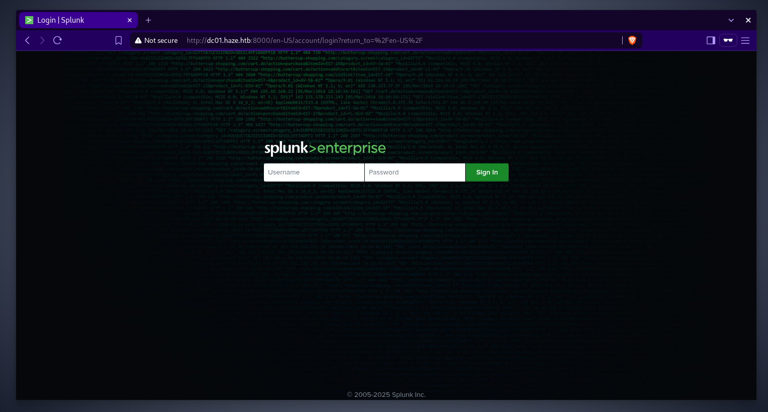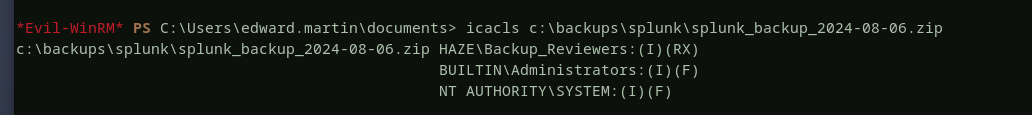 by exploiting an lfi vulnerability in splunk, we will retrieve paul's encrypted password inside authentication.conf file, after decrypting the password and spraying it, we find that the user mark is using the same password as paul. the user mark has write permission over the msDS-GroupMSAMembership attribute of the haze-it-backup$ account, we will exploit this permission to read haze-it-backup$'s ntlm hash, then we will set up shadow credentials for the user edward by writing a public key to the msDS-KeyCredentialLink attribute. using the shadow credentials we will login to the domain controller and download a splunk backup zip file to our machine where we will find alexander's password. using this passwrod we can access the splunk instance as admin and deploy a revesehell there, finally we will abuse the SeImpersonatePrivilege privilege that alexander has to obtain a reverse shell as system.