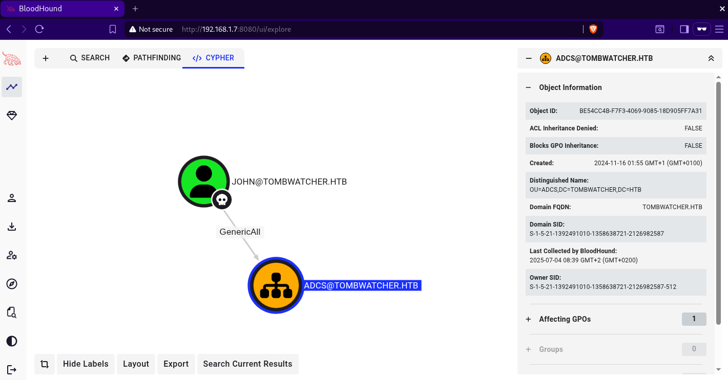 [+] john has now GenericAll on ou=adcs,dc=tombwatcher,dc=htb